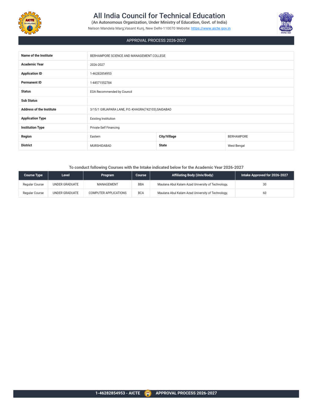 Berhampore Science and Management College is a Management College in Berhampore, West Bengal, Approved by AICTE.